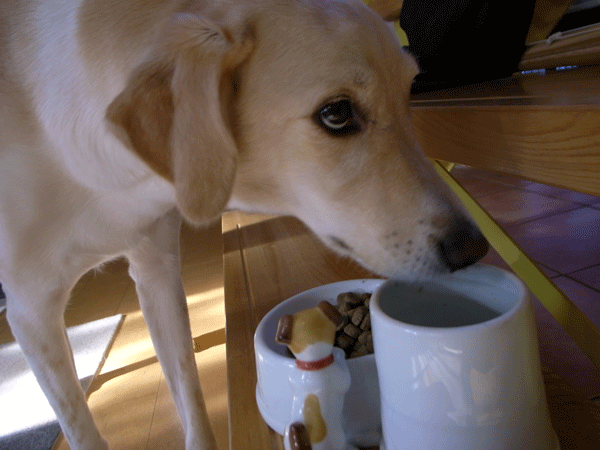 ケージの中の食べかけおやつが気になって、ケージの外に出られなくなったラムネ。もっと美味しそうなおやつでつり出されましたが、あのままにしておくと、トイレはしたい、水が飲みたい、お腹がすいた、でもおやつが気になる、で身動きが取れなくなることもあります。結果として、美味しいおやつが貰えるのだから、演技している可能性も完全に排除できない、変なワンコのラムネです。